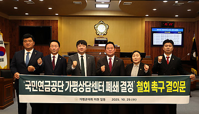 【 주요사업장 8개소 현지 확인 실시 】【 국민연금공단 가평상담센터 폐쇄 결정 철회 촉구 결의문 채택 】【 조례안·동의안 및 2026년도 세출예산 출연계획안 등 의결 】 가평군의회(의장 김경수)는 10월 29일(수)…