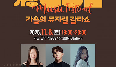 11월 8일, 음악역1939 뮤직홀… 김솔‧추연성‧오희선 출연 가평군은 오는 8일, 음악역1939 뮤직홀에서 올해 마지막 무대인 ‘가평 토요 라이브(G-SL)’ 뮤지컬 갈라쇼 공연을 개최한다고 밝혔다. 이번 11월 …