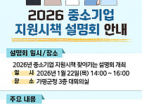 1월 22일 군청에서 열려… 정책파악‧현장상담 한번에 해결 가평군이 관내 중소기업의 경영 안정과 경쟁력 강화를 위해 새해 정부의 지원시책을 한자리에 모아 안내하는 설명회를 연다. 가평군은 관내 중소기업을 대상으로 ‘2026년 중소기업 지원시책 설명회’를 오는 22일 오후 2시 가평군청 3층 대회의실에서 개최한다고 밝혔다. 이번 설명회는 2026년도 중소기업…