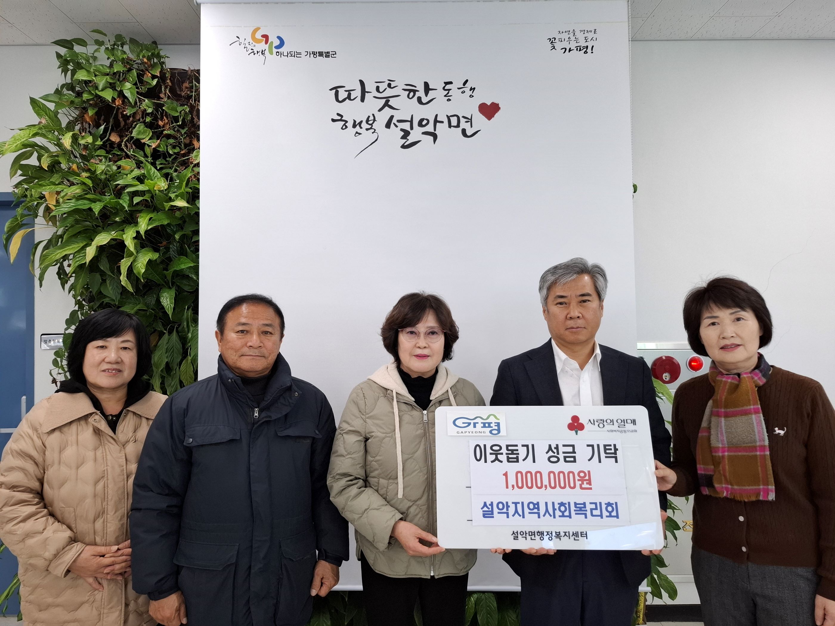 가평군 설악지역사회복리회 김진열 회장 등은 22일 설악면 행정복지센터를 방문에 이웃돕기 성금 100만원을 기탁했다.