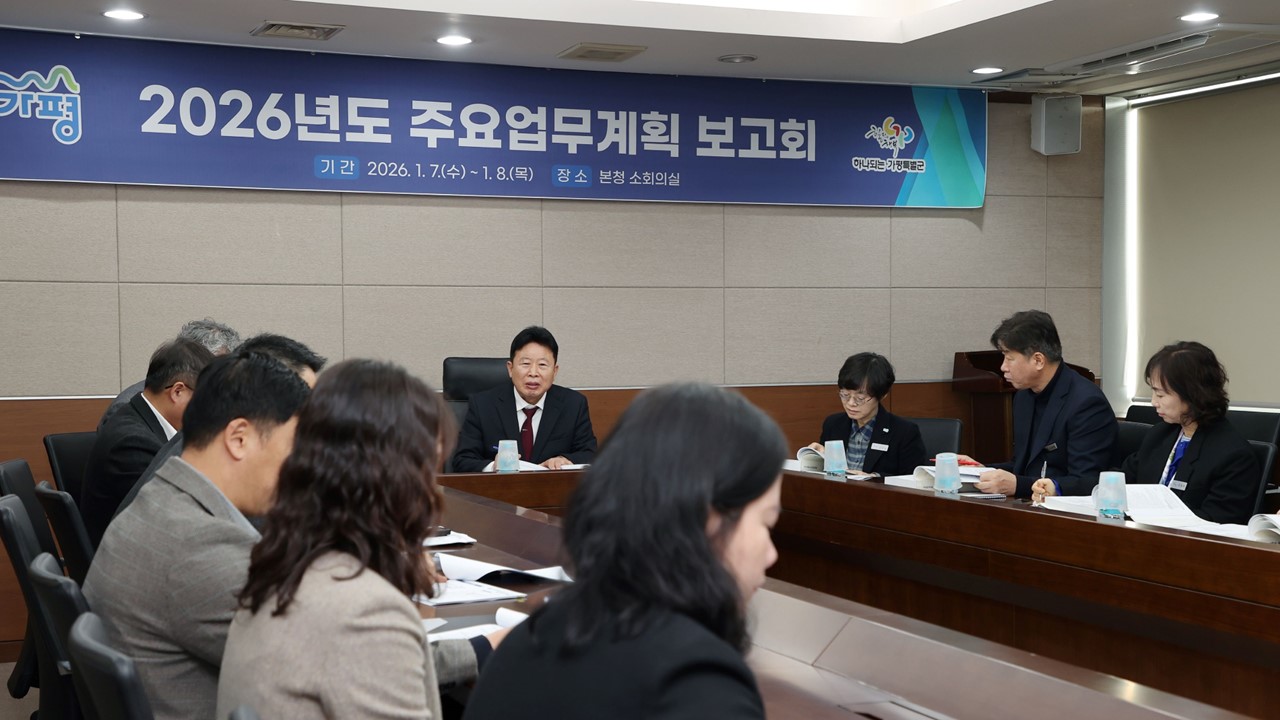 가평군은 7일부터 8일까지 이틀간 ‘2026년도 주요업무계획 보고회’를 열고, 2025년 사업 성과를 공유하는 한편 추진 과정에서 드러난 문제점을 점검하고 개선 방안을 논의했다. 보고회는 2026년 부서별 주요 현안과 중점 사업을 차질 없이 추진하기 위한 준비 과정으로 마련됐다.