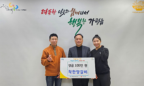 가평군 가평읍 경춘로 소재 착한양갈비는 지난 19일 행정복지센터를 방문해 이웃돕기 성금 100만 원을 기탁했다. 이명열 착한양갈비 대표는 “사업체를 운영하면서 우리 지역에 도움 될 수 있는 일이 무엇일까 고민하다 딸…
