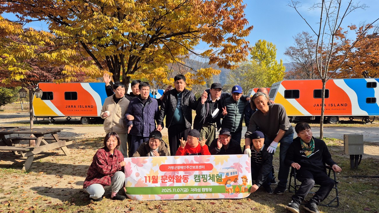 가평군장애인주간보호센터(관장 김명주)는 문화활동의 일환으로 11월 7일(금) 이용자 11명과 자라섬 카라반에서 캠핑체험을 진행하였다.