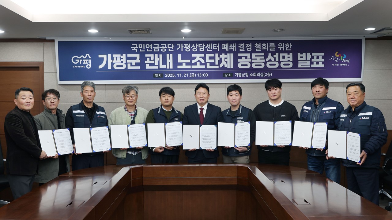 가평군공무원노동조합을 비롯한 지역 8개 노동조합·직장협의회 대표들은 21일 가평군청에서 공동성명서를 발표하며, “국민연금공단의 가평상담센터 폐쇄 결정을 즉각 철회하라”고 촉구했다. 이날 발표에는 서태원 가평군수도 직접 참석해 노조들과 연대 의지를 분명히 했다.