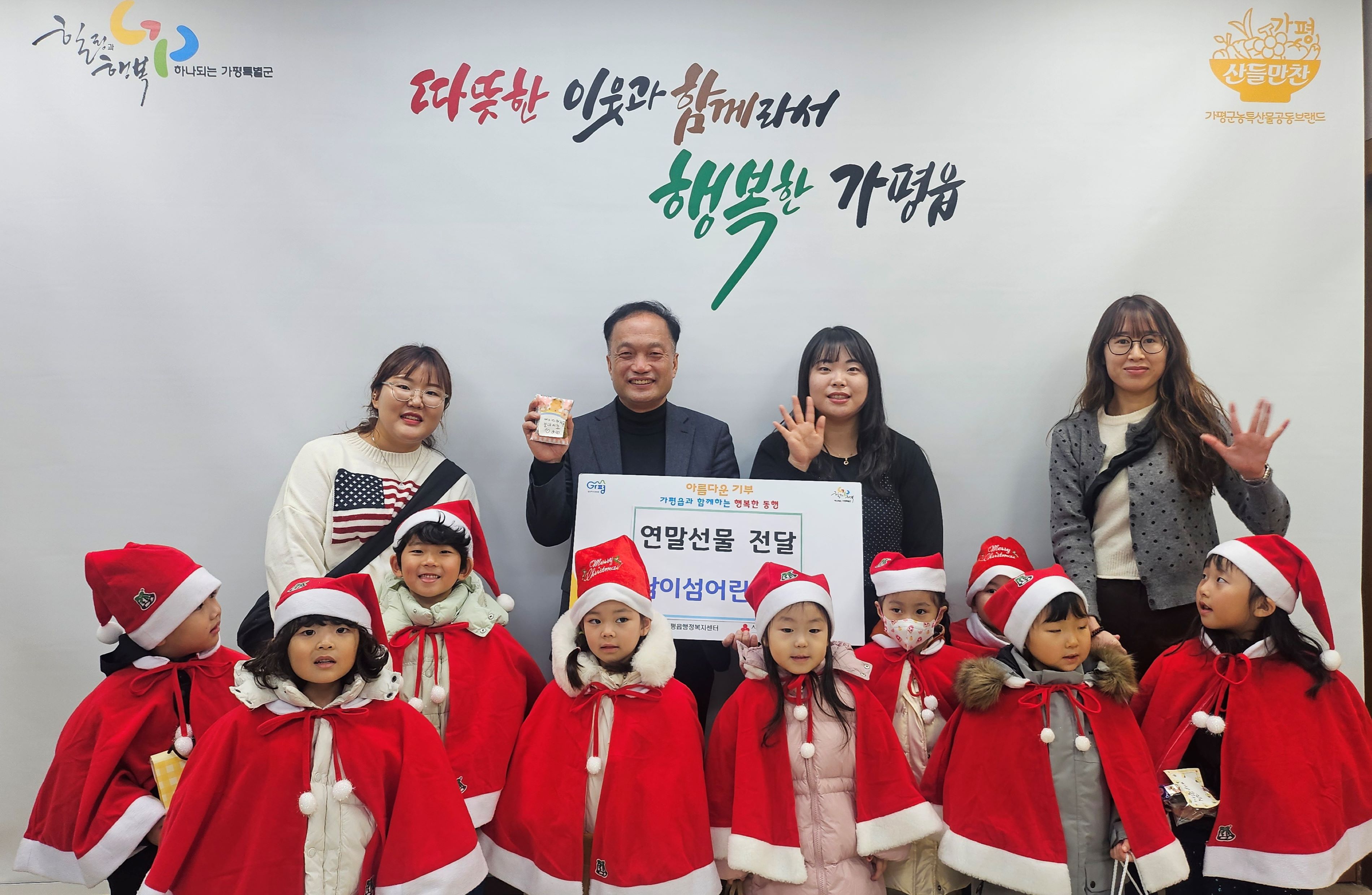 가평군 가평읍 소재 남이섬어린이집 선생님과 아이들은 지난 19일 가평읍 행정복지센터를 방문해 따뜻한 연말 선물을 전달했다.어린이집 선생님과 아이들추운 겨울 우리 이웃들이 따뜻한 겨울을 보내길 바라는 마음으로 손수 만든 선물을 전달하기 위해 방문했다며 선물을 전달했다.