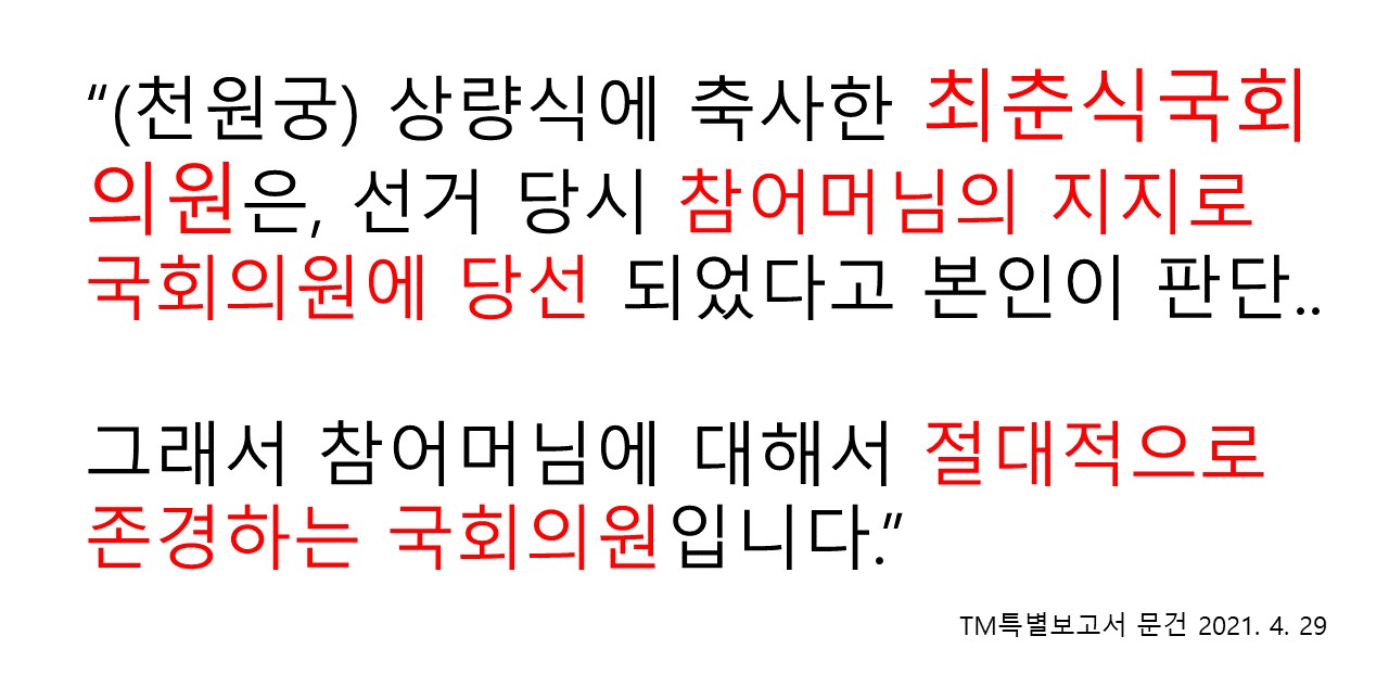 가평팩트가 입수한 TM특별보고 2021년 4월 29일 문건에는 통일교 천일국 경배 기념식 및 천원궁 상량식 행사에 최춘식 전 국회의원이 참석하고 축사를 했다.
