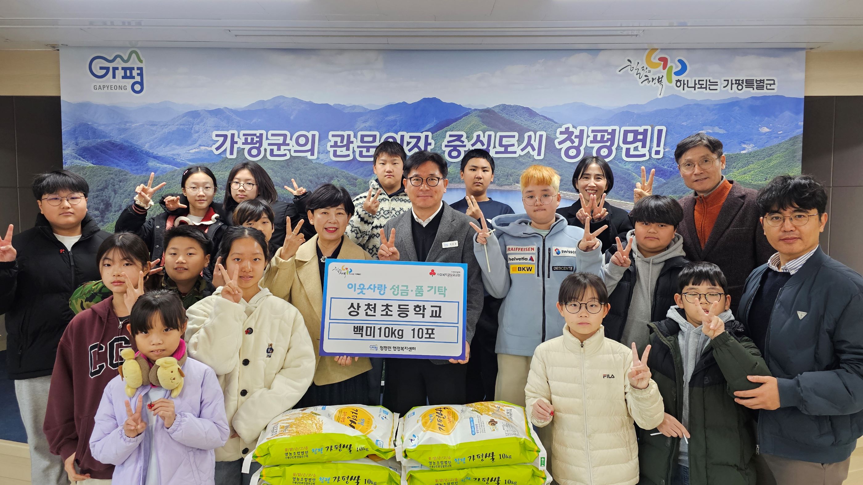가평군 청평면 상천초등학교 교직원과 학생들이 최근 청평면 행정복지센터를 찾아 지역의 어려운 이웃을 위해 백미 10포(10kg 들이)를 기탁했다.