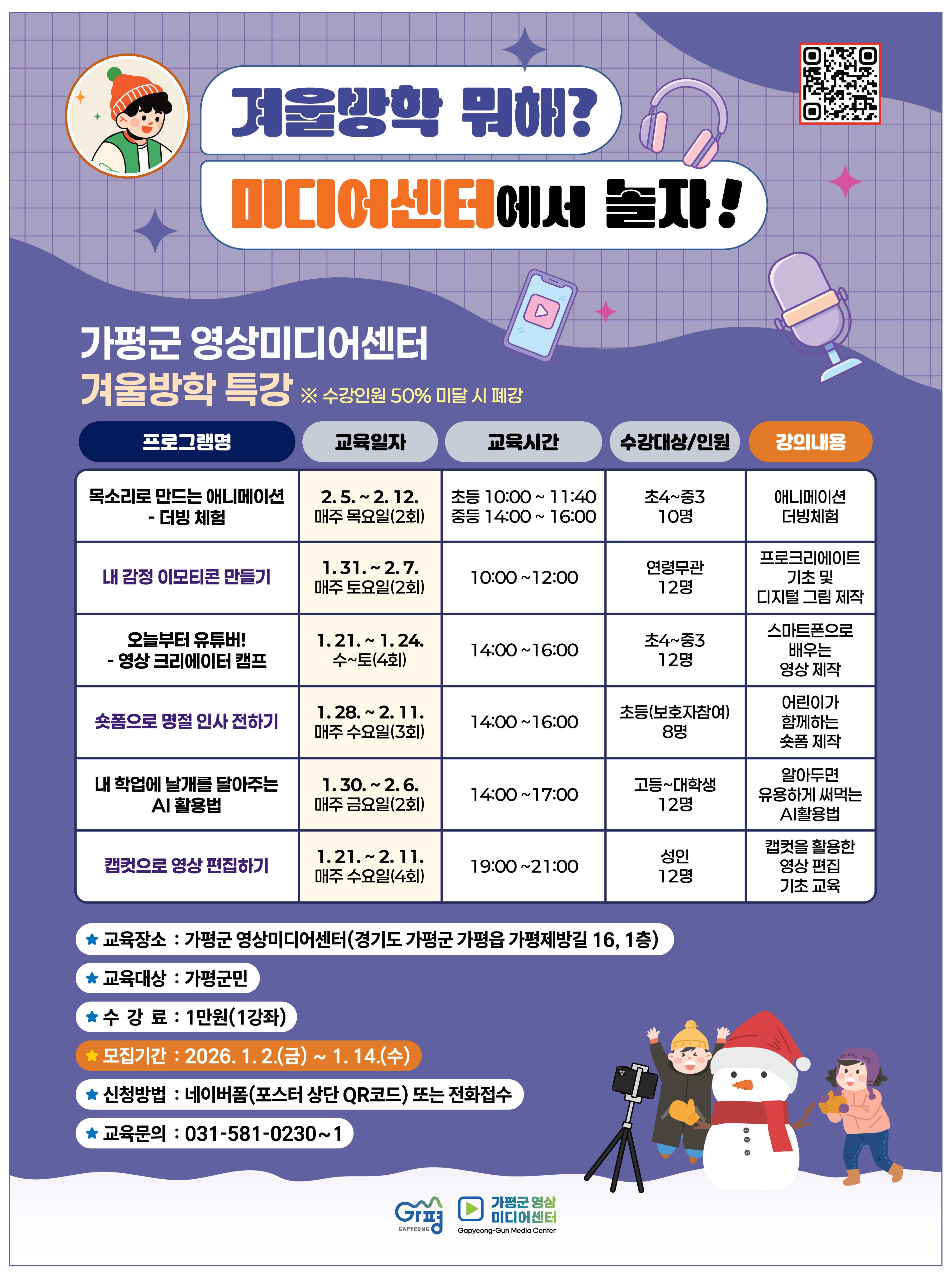 겨울방학, “가평 영상미디어센터로 오세요”
