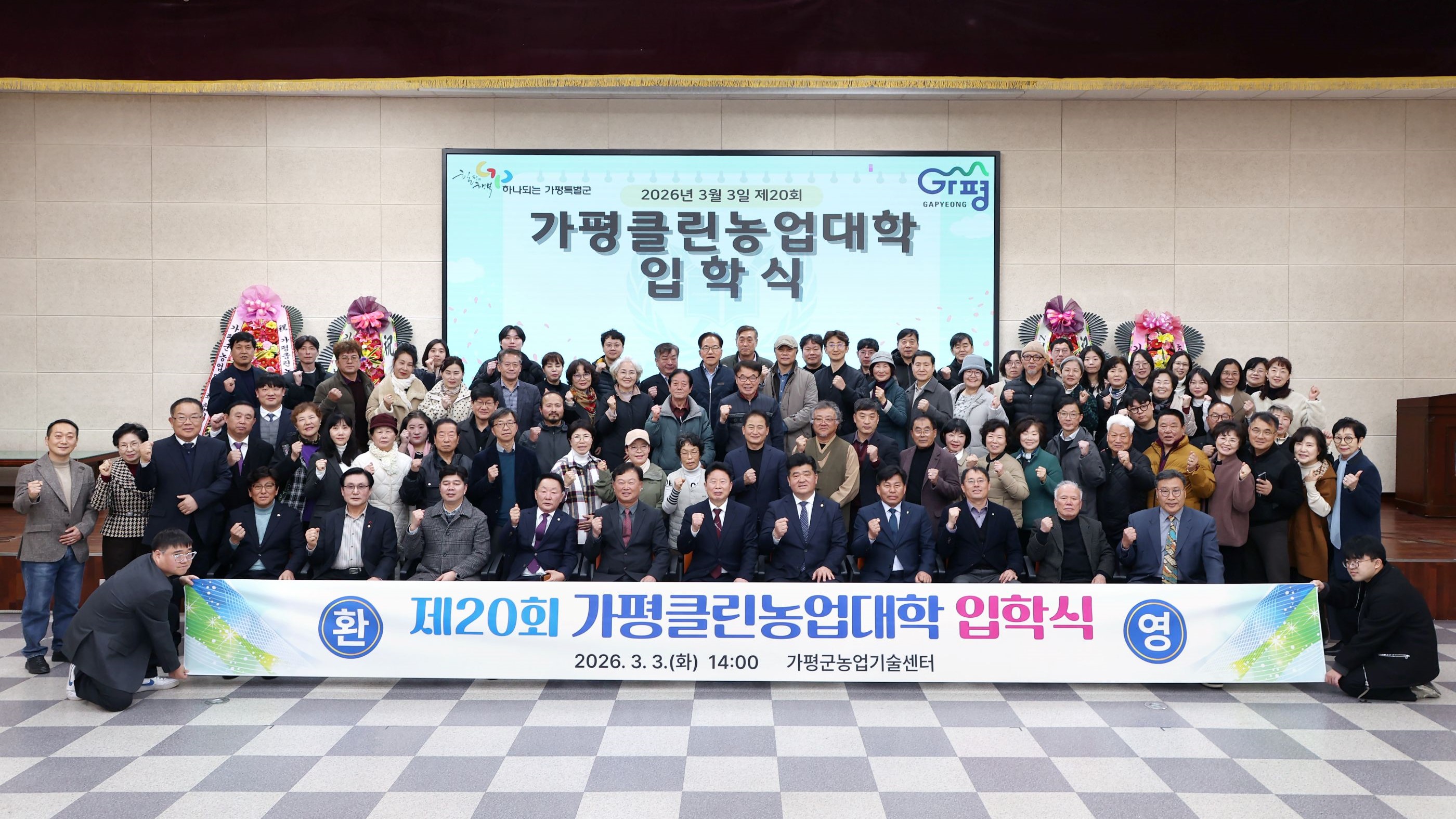 가평클린농업대학이 3일 농업기술센터 3층 대강당에서 ‘2026년 제20회 가평클린농업대학 입학식을 열고 76명의 신입생을 맞았다. 입학식에는 농식품학과, 스마트농업과, 농촌관광과 입학생과 내빈 및 관계자 등 90여명이 참석해 새로운 출발을 축하했다.