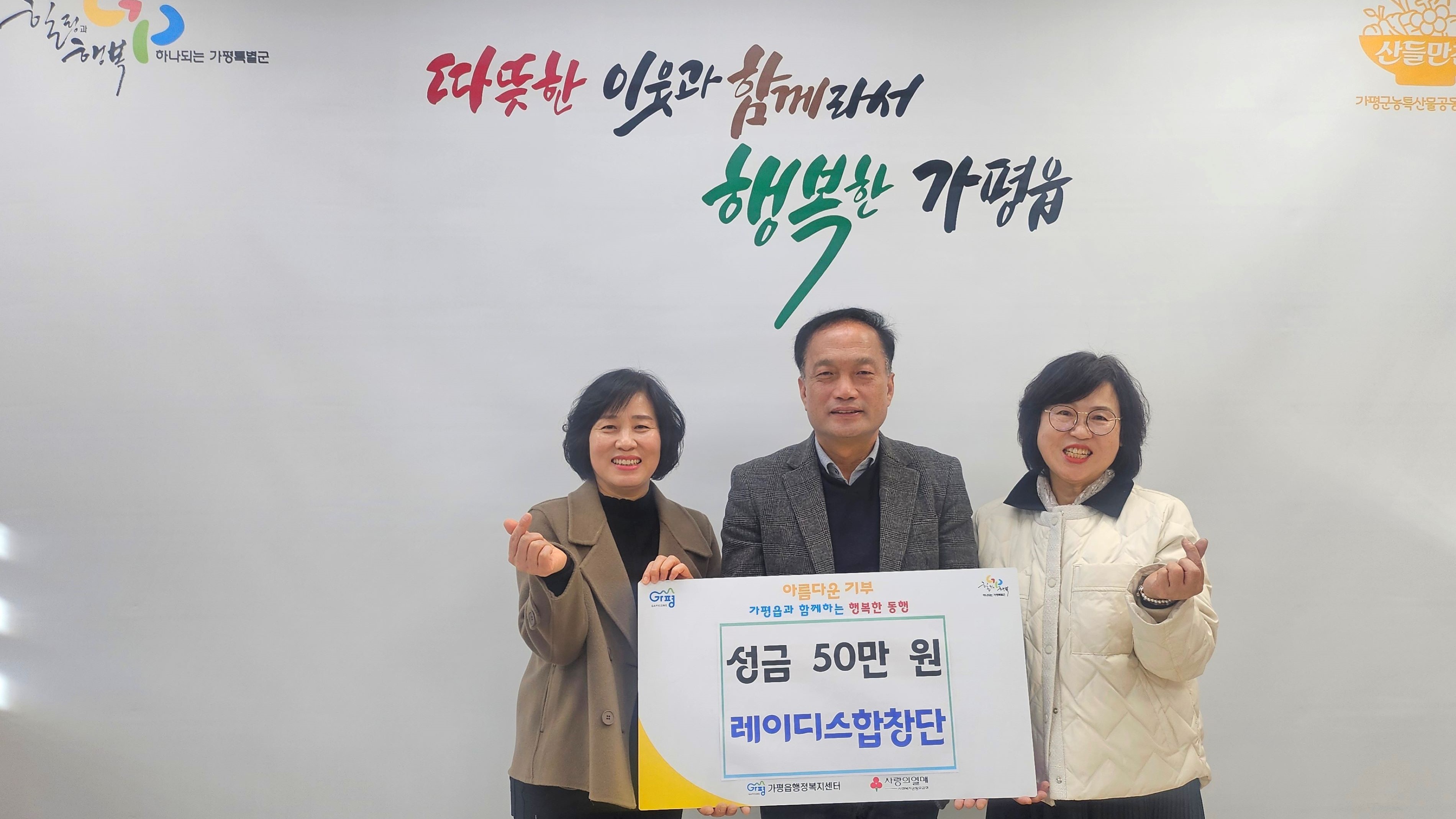 장석조 가평읍장은 지역 발전에 꾸준히 협조해 주시는 레이디스합창단에 깊이 감사드린다기탁자의 뜻에 부응해 더욱 노력하는 행정복지센터가 되겠다고 밝혔다.