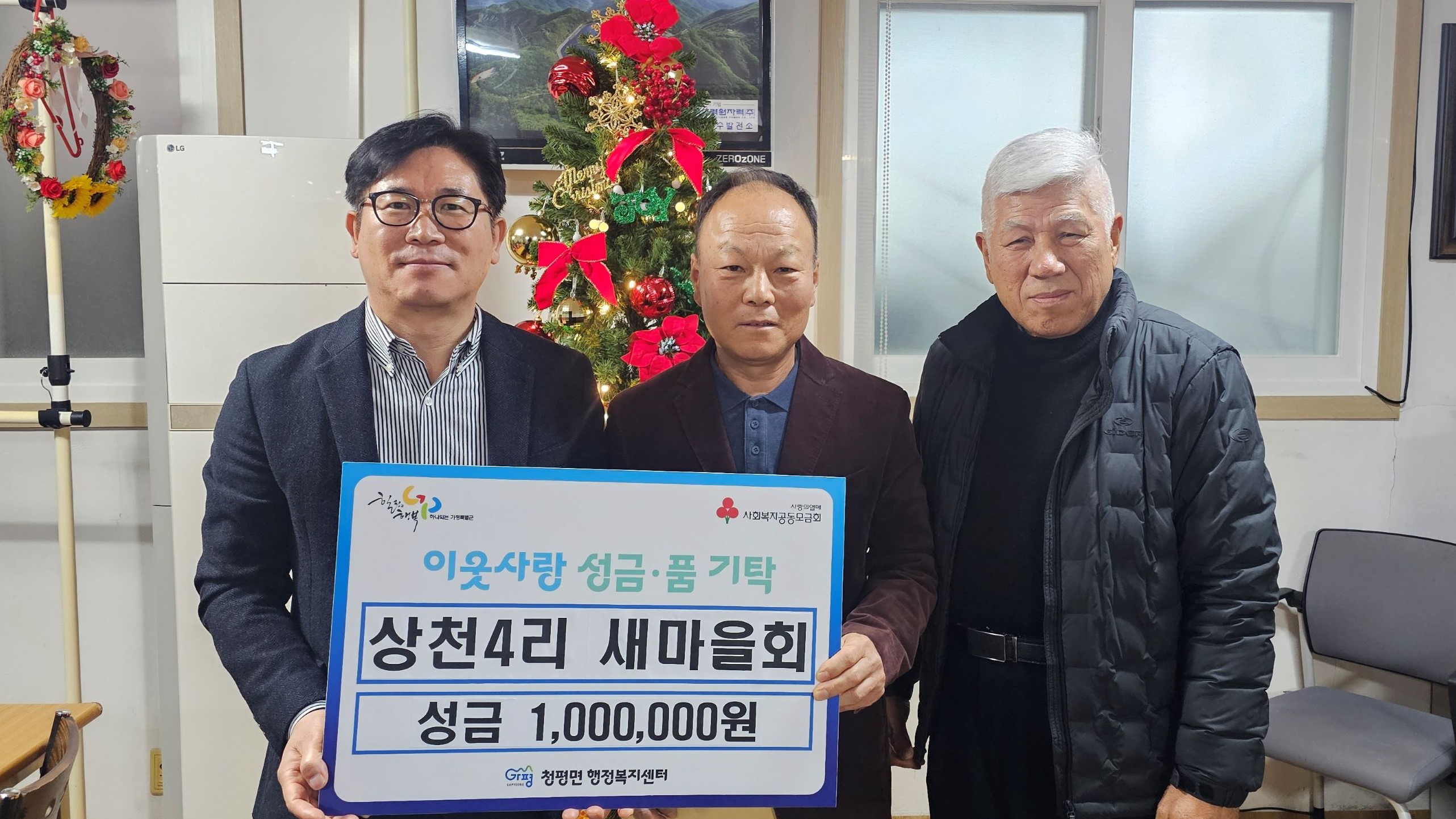 박성규 청평면장은 “어려운 이웃을 위해 나눔을 실천해 준 상천4리 새마을회에 깊이 감사드린다”며 “기탁된 성금은 꼭 필요한 가구에 소중히 전달하겠다”고 밝혔다.
