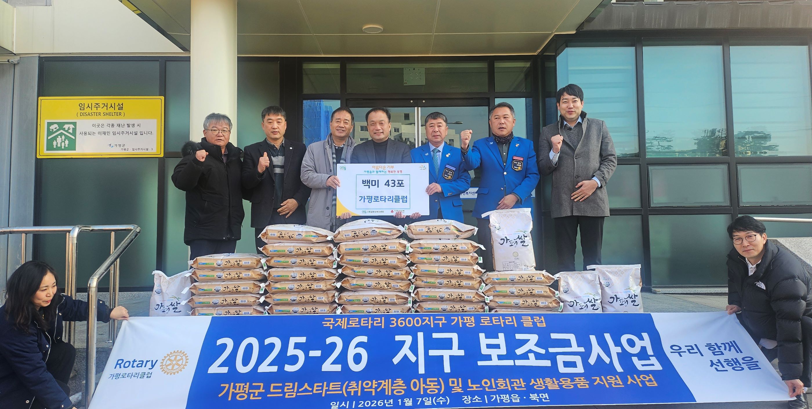 가평로타리클럽은 최근 가평읍 행정복지센터를 방문해 130만원 상당의 백미 43포대를 기탁했다. 이번 성품 기탁은 병오년 새해를 의미 있는 나눔으로 시작하자는 회원들의 뜻을 모아 마련됐다.