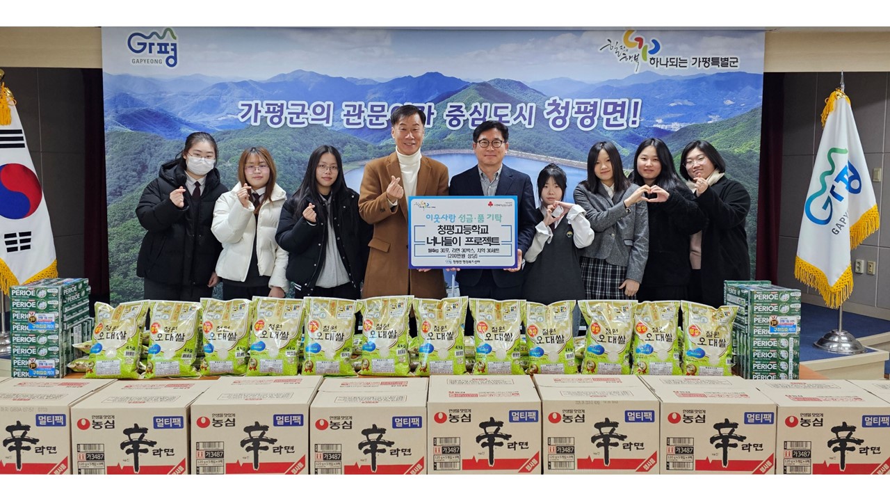 가평군 청평고등학교 교직원과 학생들은 지난 연말 청평면 행정복지센터를 방문해 200만원 상당의 쌀(4kg들이) 30개, 라면 30박스, 치약30세트를 기탁했다.