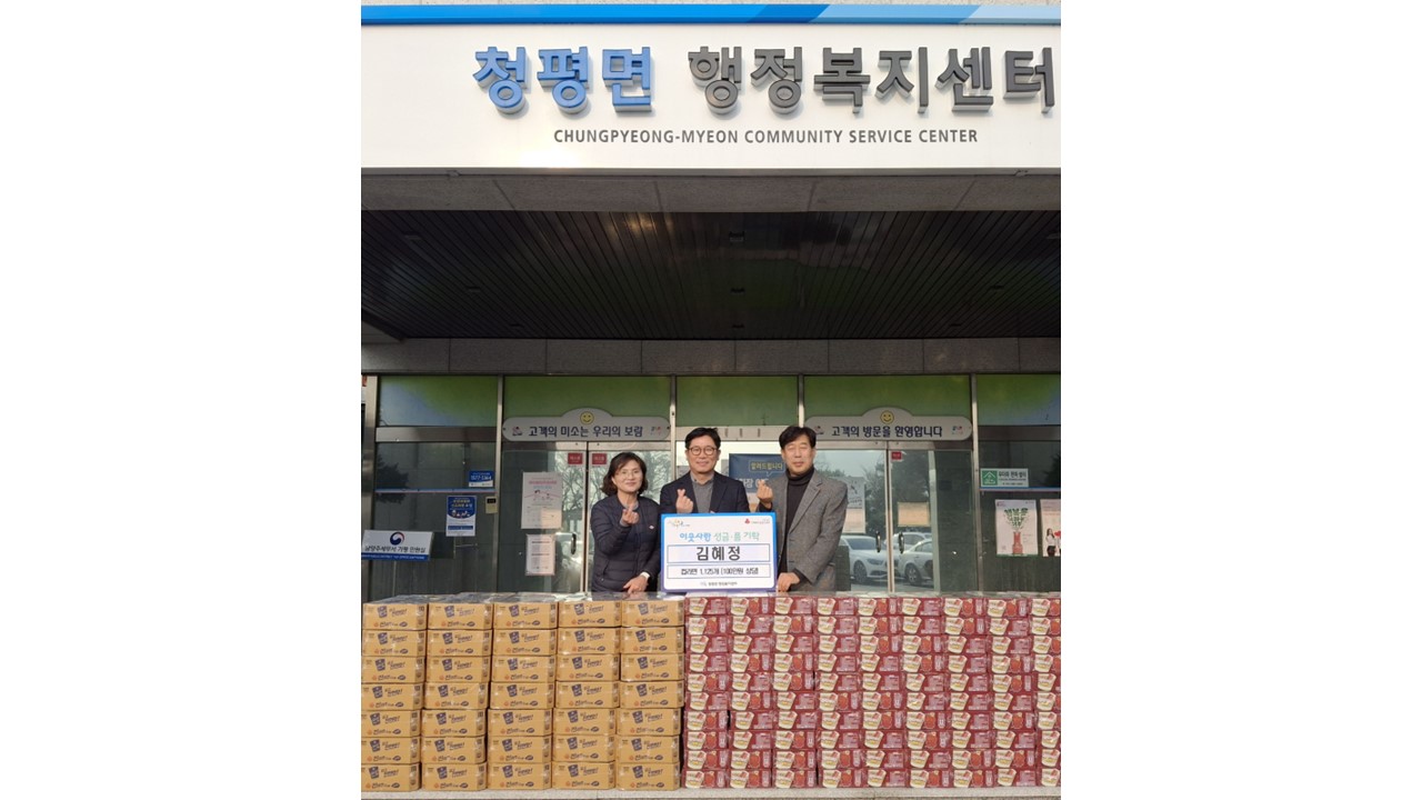 가평군 청평면 김혜정 씨는 29, 어려운 이웃들을 돕기 위해 컵라면 1,125개를 청평면 행정복지센터에 기탁하며 따뜻한 나눔을 실천했다.