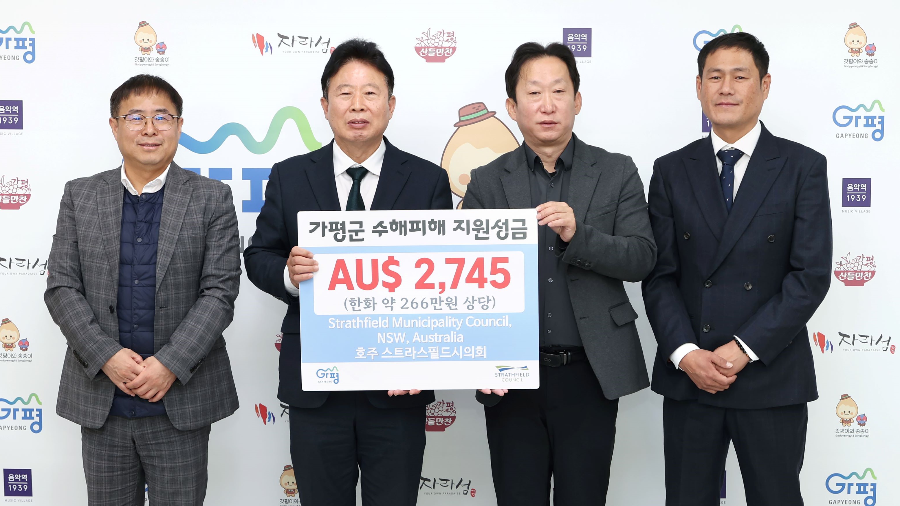스트라스필드시 의회와 지역 주민들은 총 2,745호주달러(한화 약 266만 원)를 모금해 5일 가평군에 전달했다. 이번 성금은 가평군민들의 복지 향상 사업에 사용할 예정이다.