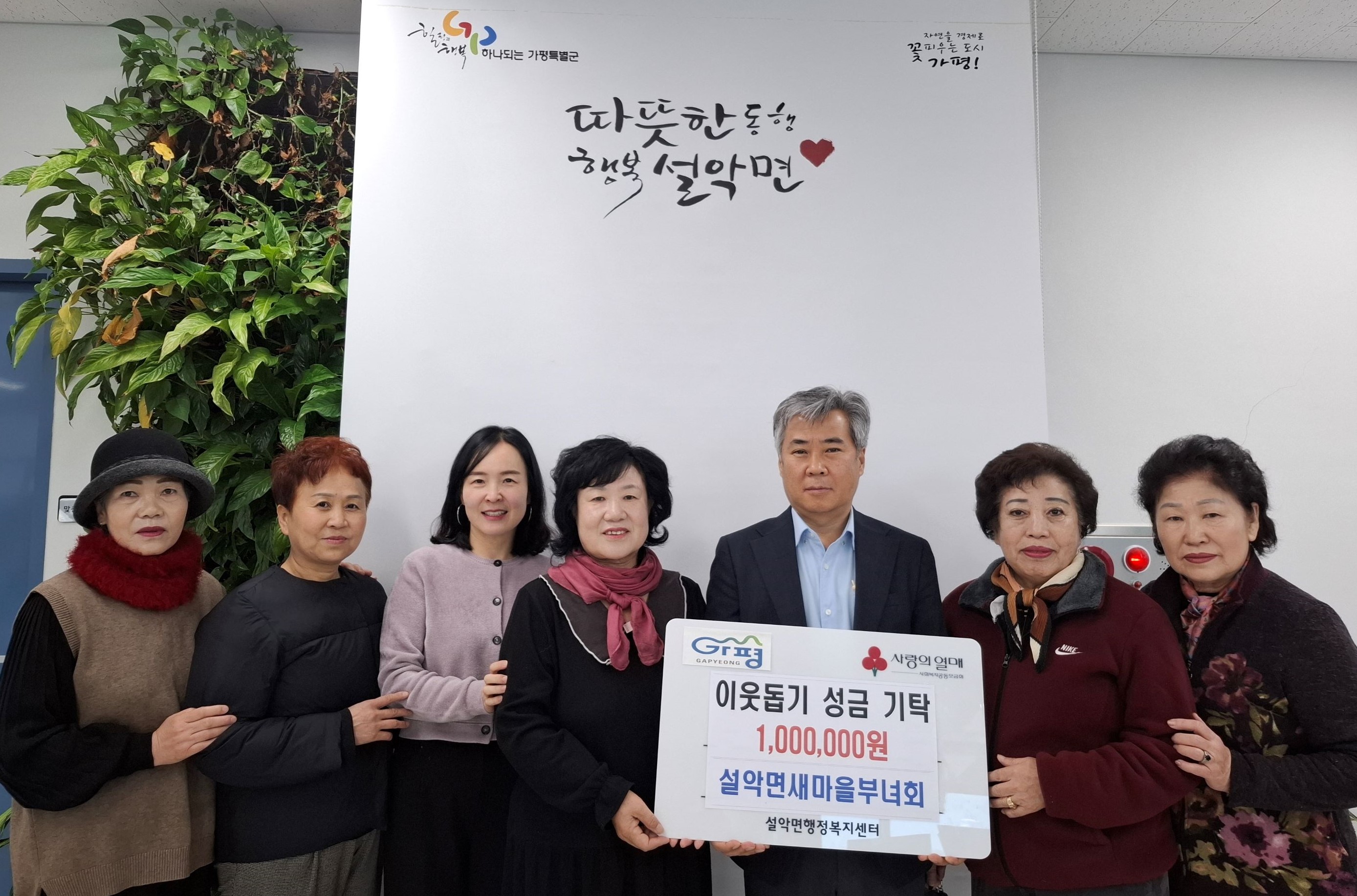 가평군 설악면 새마을부녀회 김정희 회장과 임원진은 12일 설악면행정복지센터를 방문해 이웃돕기 성금 100만원을 기탁했다.