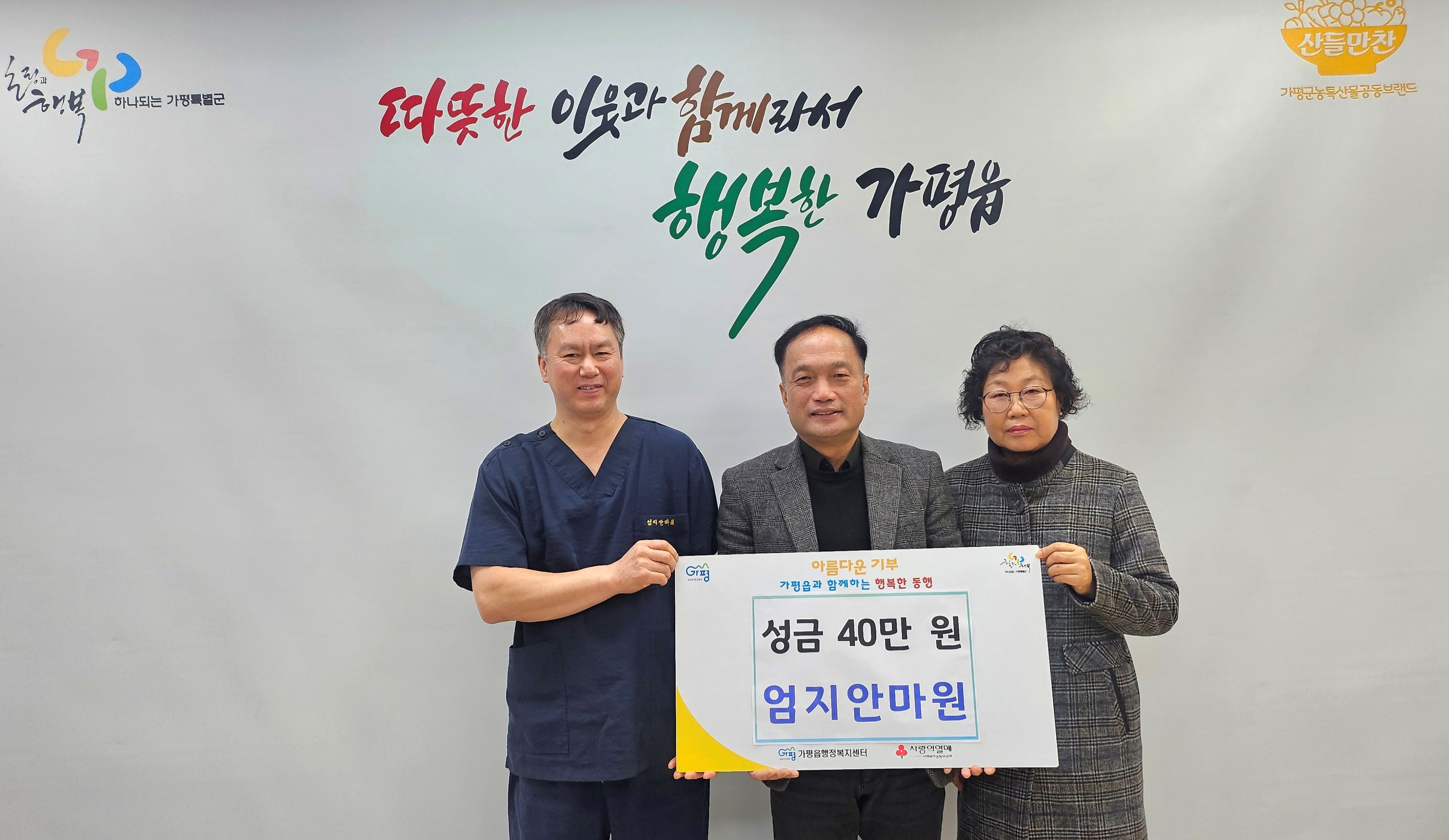 가평군에 소재한 엄지안마원은 최근 가평읍 행정복지센터를 방문해 이웃돕기 성금 40만 원을 기탁했다.