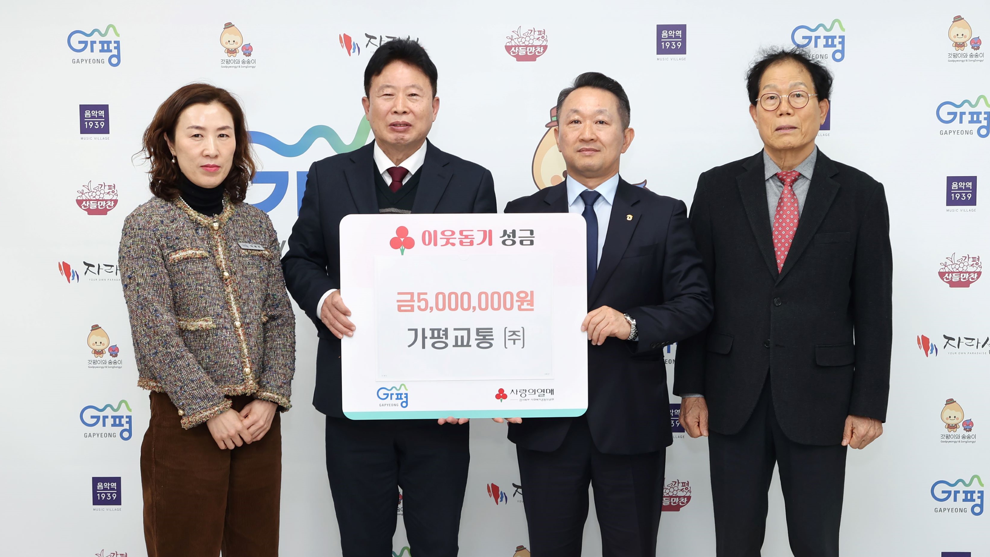 가평교통㈜는 17일 가평군청을 방문해 이웃돕기 성금 500만 원을 기탁했다.