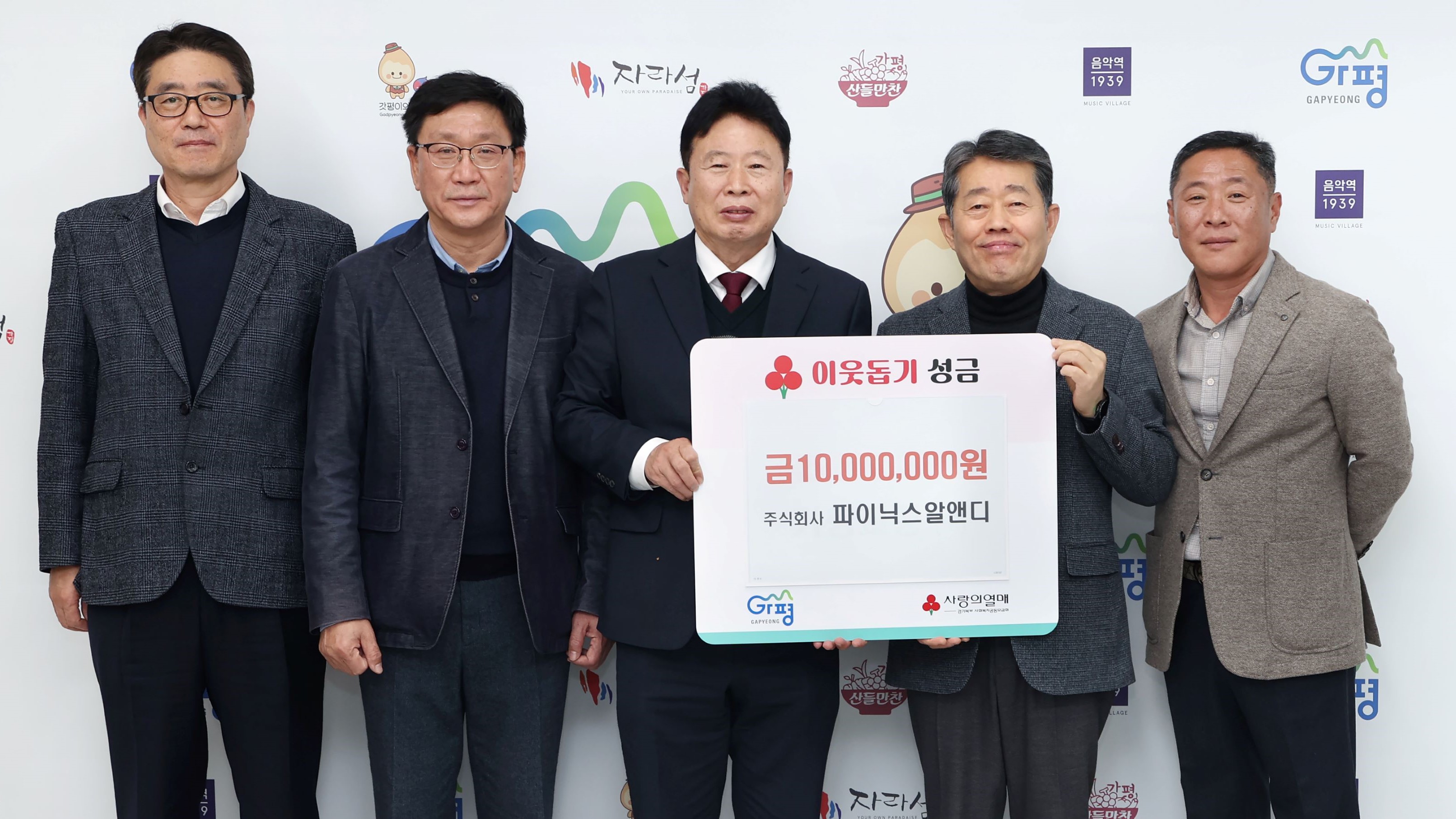 ㈜파이닉스알앤디는 17일 가평군청을 방문해 이웃돕기 성금 1천만 원을 기탁했다.