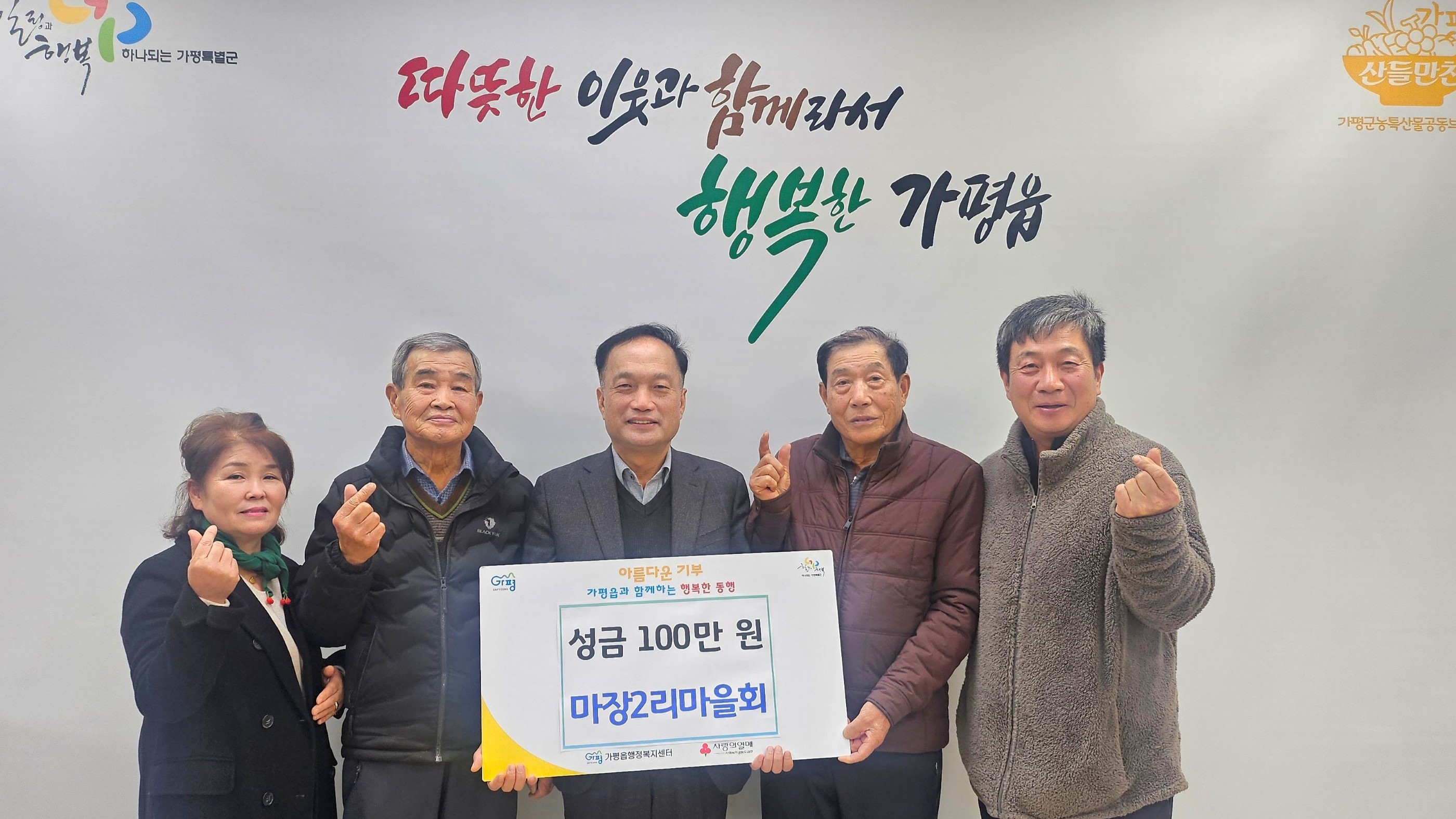 가평군 가평읍 마장2리 마을회는 최근 행정복지센터를 방문해 취약계층 이웃을 돕기 위한 성금 100만 원을 전달했다.