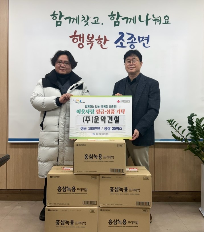 가평군 소재 운악건설은 설 명절을 앞두고 최근 조종면 행정복지센터를 방문해 성금 100만 원과 홍삼 20박스를 기탁하며 이웃사랑을 실천했다.