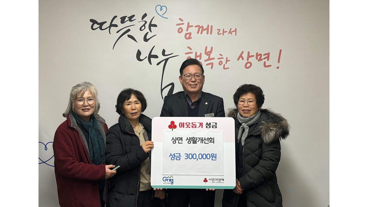 서태원 상면장은 “명절마다 이웃을 생각하며 따뜻한 나눔을 실천해 주시는 상면 생활개선회 회원 여러분께 진심으로 감사드린다”며 “기탁해 주신 성금은 도움이 꼭 필요한 이웃들에게 소중히 전달하겠다”고 말했다.