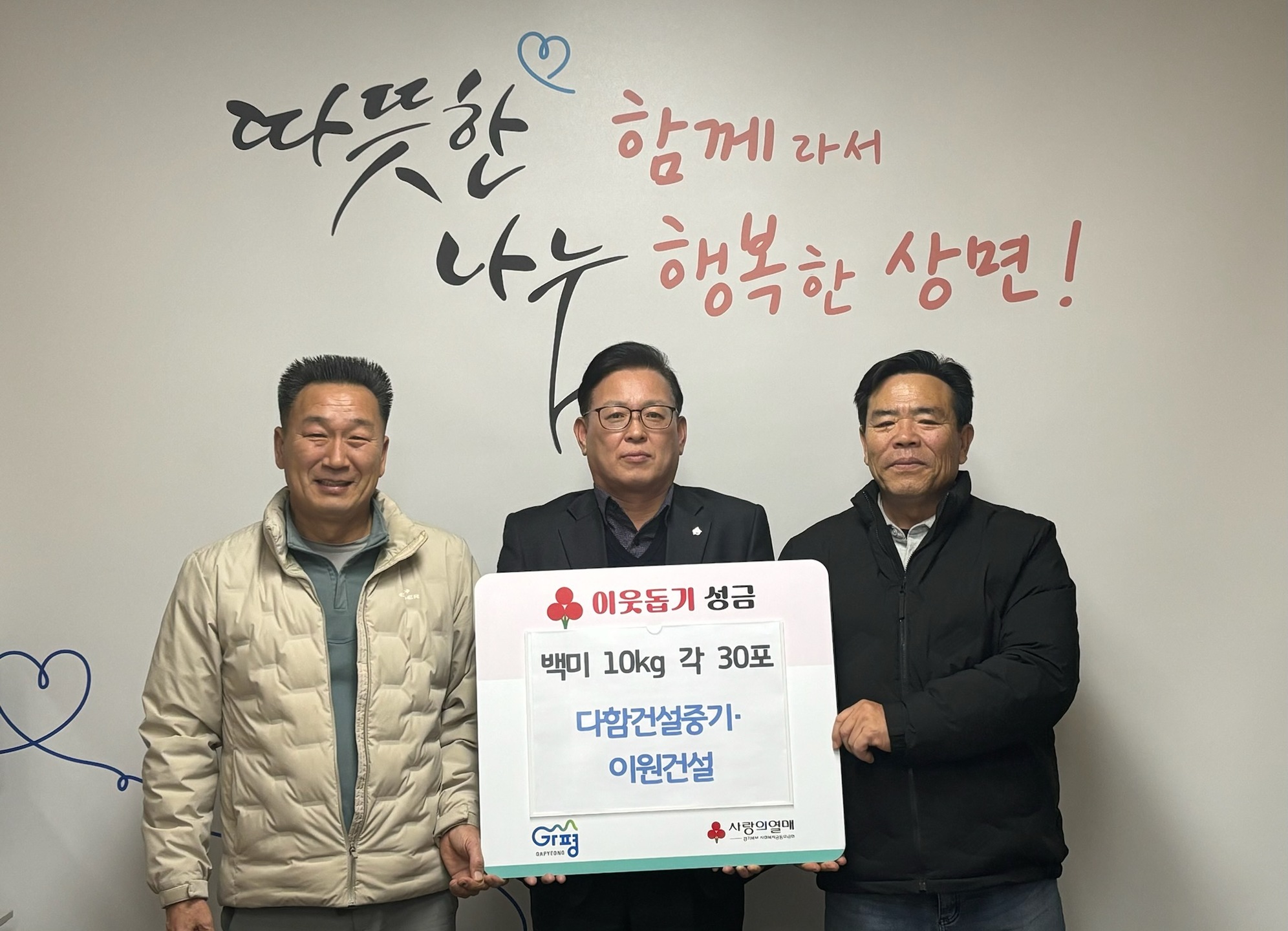 다함건설중기‧이원건설, 백미 각각 30포씩 전달