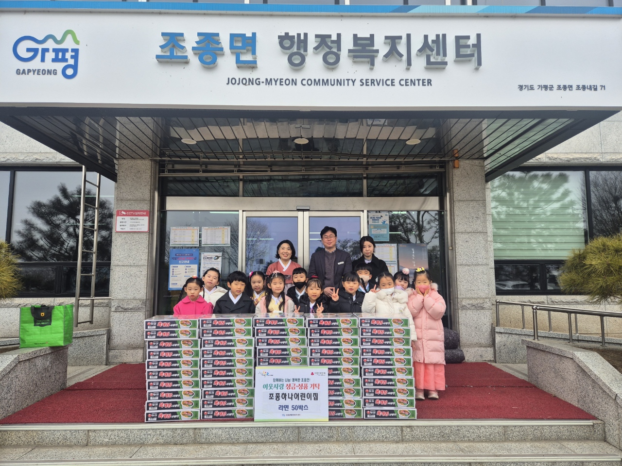 가평 조종하나어린이집은 최근 원아들과 함께 조종면 행정복지센터에 방문해 라면 50박스를 기탁하며 이웃에게 따뜻한 정을 나눴다.