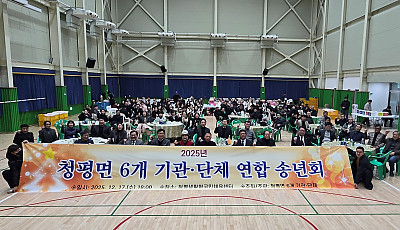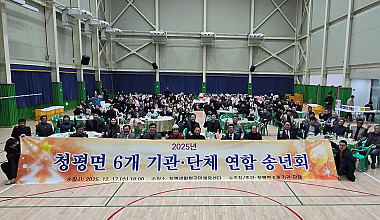 가평군 청평면은 지난 17일 청평생활형국민체육센터에서 ‘2025년 청평면 6개 기관·단체 연합 송년회’를 개최하고 한 해를 마무리하는 시간을 가졌다. 이날 송년회에는 박성규 청평면장을 비롯해 이장협의회, 주민자치회,…