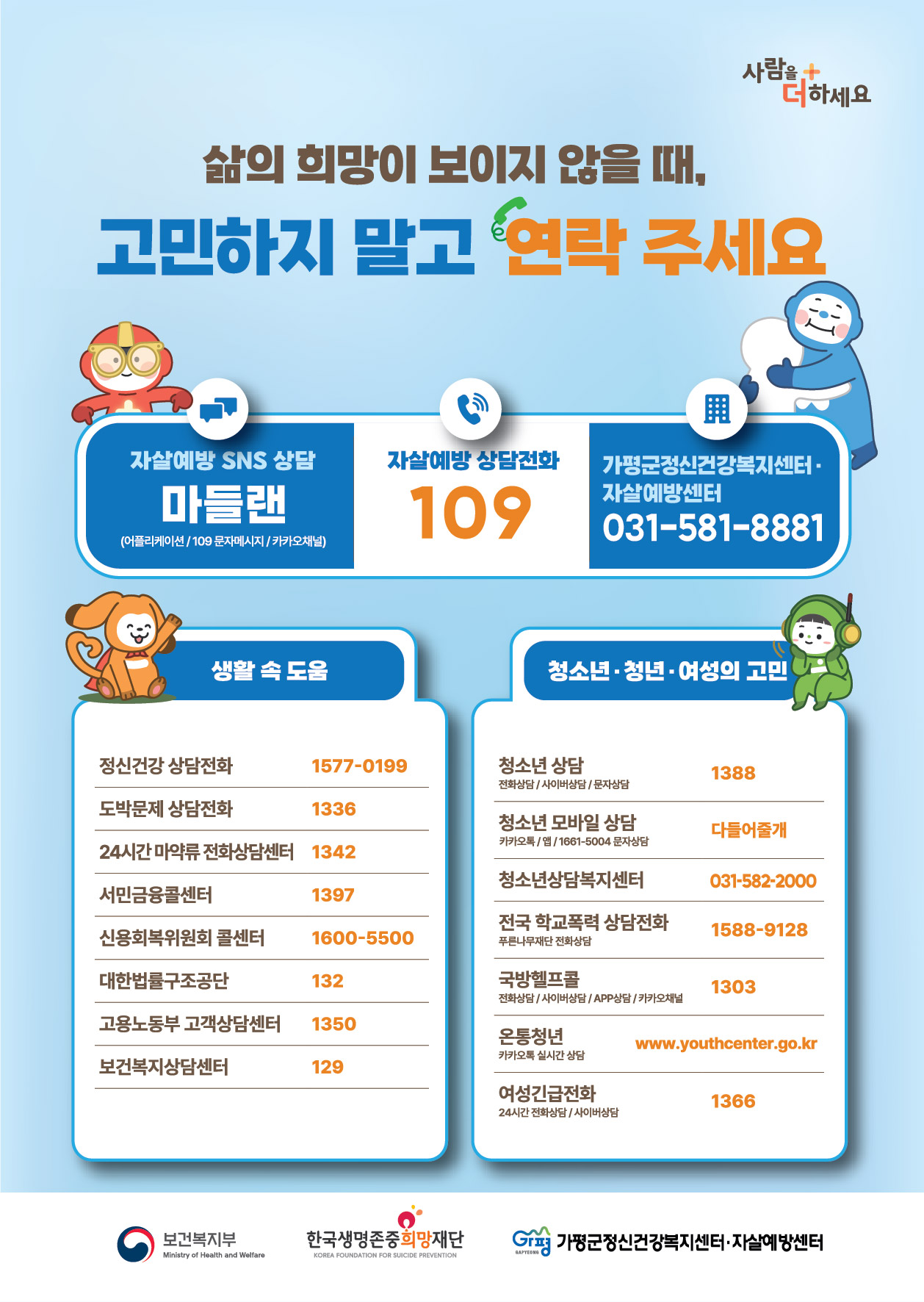 자살 예방 상담은 자살상담 전화 109(24시간) 온라인 상담 마들랜(24시간) 정신건강 위기상담전화 1577-0199(24시간) 가평군정신건강복지센터자살예방센터(031-581-8881)를 통해 할 수 있다.