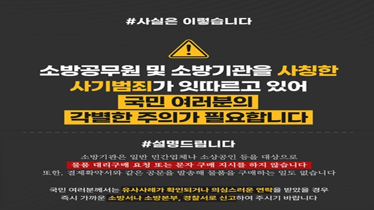 그러나 소방기관은 민간업체나 개인에게 물품 대리 구매를 요청하거나 문자로 구매 지시를 하는 경우가 전혀 없으며, 공문을 통해 특정 업체에 물품 구매를 요구하는 일 또한 없다. 따라서 이와 같은 요청은 모두 사기 가능성이 높은 만큼 각별한 주의가 필요하다.