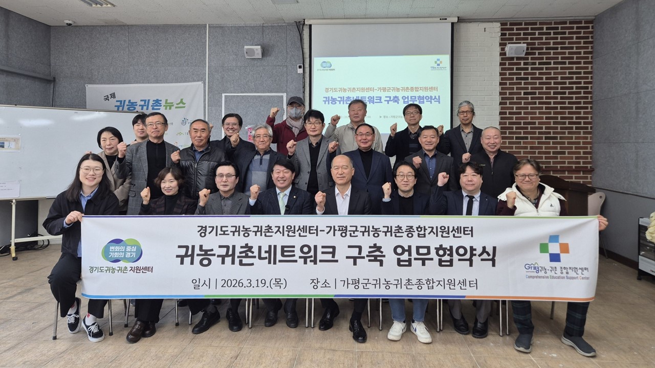 가평군귀농귀촌종합지원센터와 경기도귀농귀촌지원센터는 19일 가평 교육장에서 귀농귀촌 네트워크 구축을 위한 업무협약(MOU)을 체결했다. 이번 협약은 귀농귀촌 희망자의 안정적인 농촌 정착을 지원하고 경기도 농어촌의 지속 가능한 발전을 도모하기 위해 마련됐다.