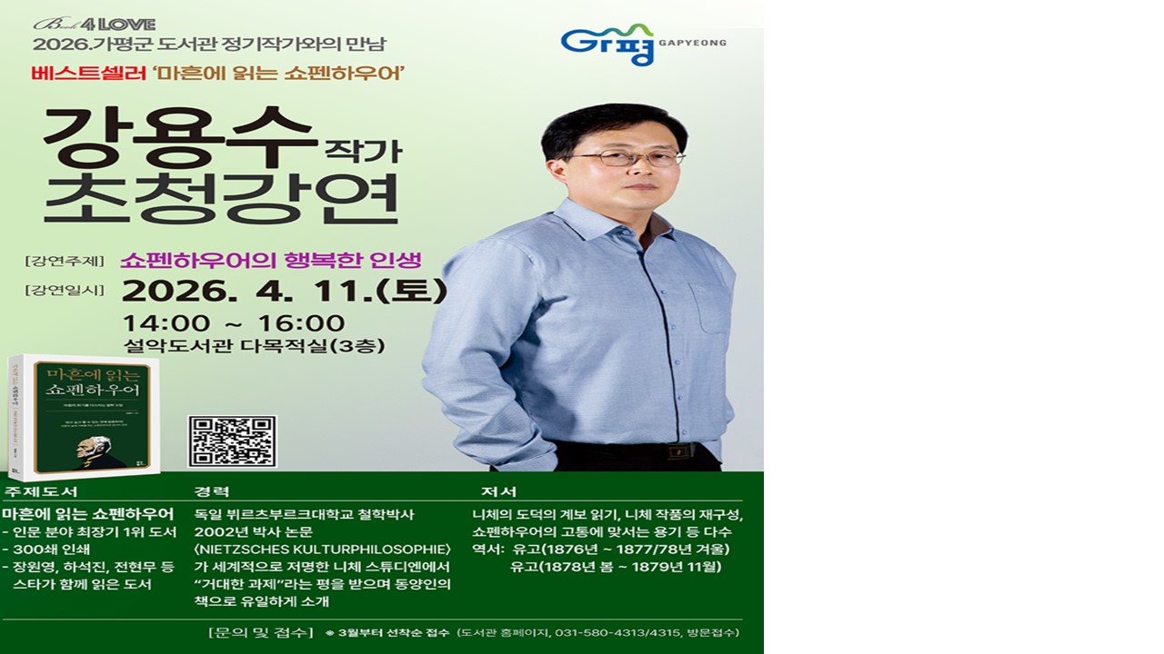 군 도서관은 올해 첫 강연으로 오는 411일 설악도서관에서 강용수 작가를 초청해 쇼펜하우어의 행복론을 주제로 강연을 진행한다고 23일 밝혔다.