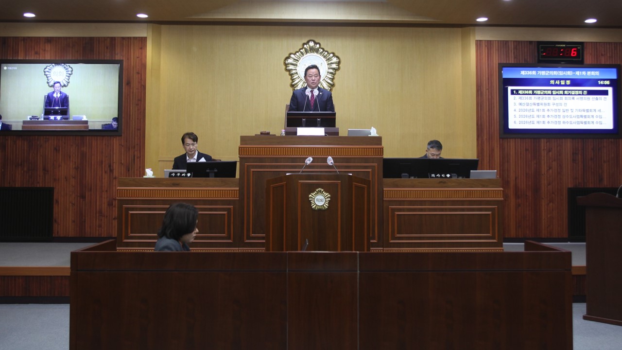 가평군의회는 이번 임시회 기간 중 324일부터 41일까지 9일 동안 예산결산특별위원회를 열고 ▲「2026년도 제1회 추가경정 일반 및 기타특별회계 세입·세출 예산안」 ▲「2026년도 제1회 추가경정 상수도사업특별회계 수입·지출 예산안」 ▲「2026년도 제1회 추가경정 하수도사업특별회계 수입·지출 예산안」 ▲「2026년도 가평군 기금운용계획 변경안」 ▲「2026년도 제1차 수시분 가평군 공유재산 관리계획안을 심사한다.