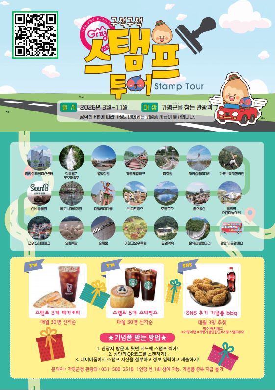 가평군은 이달 20일부터 11월 30일까지 관외 관광객을 대상으로 ‘2026년 가평 구석구석 스탬프투어’를 운영한다고 밝혔다.