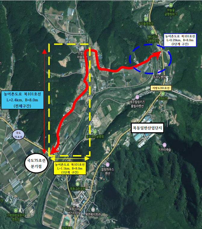 북101호선은 북면 제령리 목동교회 인근에서 소법리 골말교 인근까지 이어지는 총 2.4km 구간이다. 1단계 사업은 2023년 12월 준공과 함께 도로를 개통했으며, 군은 2024년부터 2단계 구간 노선 지정을 위한 행정절차를 진행해 왔다. 이어 올해 1월 보상 협의를 완료하면서 4월 공사 착공을 앞두게 됐다.