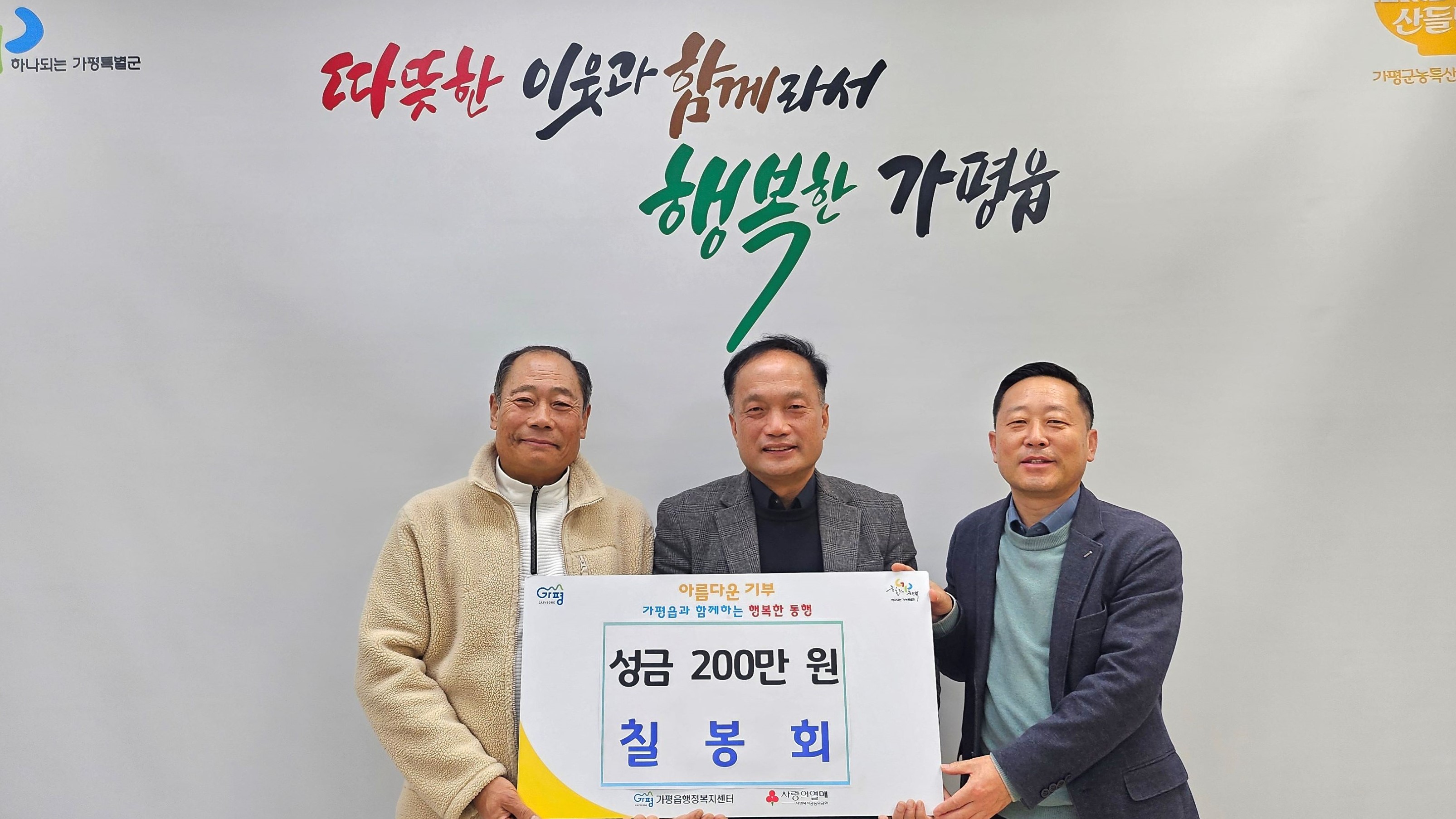 가평군 가평읍 행정복지센터는 8일 봉사단체인 칠봉회에서 이웃돕기 성금으로 200만 원을 전달했다고 밝혔다.