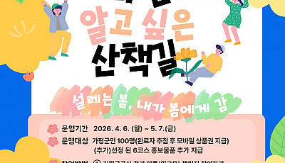 워크온 앱 활용해 20만 보 걷기 달성 및 산책 코스 개발 가평군보건소는 6일부터 5월 7일까지 가평군민을 대상으로 ‘나만 알고 싶은 산책길’ 프로그램을 운영한다고 밝혔다.이번 프로그램은 모바일 걷기 앱인 ‘워크온’…