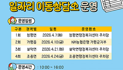 상반기 4월 한 달 4곳 순회 운영… 1:1 밀착형 취업 지원 가평군은 4월 한 달 동안 전문 직업상담사가 거점 장소를 직접 방문해 1:1 상담을 진행하는 ‘상반기 찾아가는 일자리 이동상담소’를 운영한다. 이번 사업…